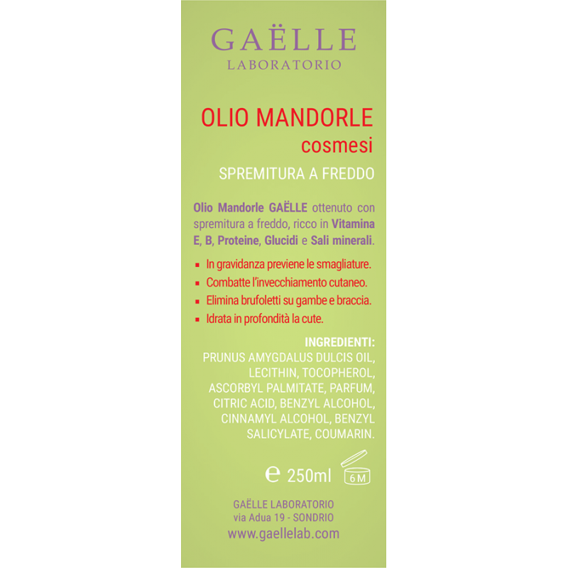 L’Olio di Mandorle GAËLLE Laboratorio è ottenuto grazie alla spremitura a freddo del frutto del mandorlo, ricco in Vitamina E, Vitamina B, Proteine, Glucidi e Sali minerali: viene favorito il mantenimento idrolipidico della pelle, combatte l’invecchiamento cutaneo aiutando il suo rinnovamento.